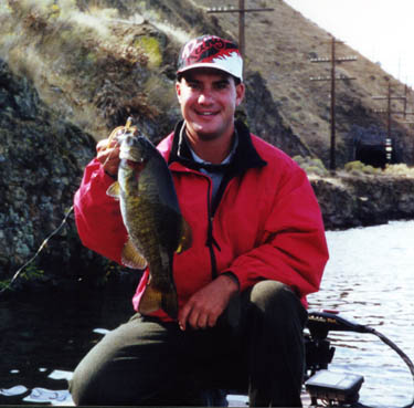 We didn't even have a map of Sacajuwea. So we just went fishing. We struggled at first, but got into a few fish later in the day. We started out cranking rip-rap, and the fish just didn't seem to be there. It wasn't until we found some vertical wall that we got into some fish. I nailed this 3lb. smallie on my third cast with a dart head worm. The fish absolutely slammed my bait about 10 feet down the wall. The boat was sitting over 70 feet of water. I got the fish on a 3/16oz. dart head and a Kalin Worm Wennie. That fished got airborne twice, and did some fancy tailwalking, trying to throw the bait. No use, my 6lb P-Line, loose drag, and spinning rod wore the fish out.