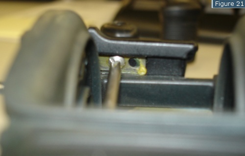 To correct the saggy thumb bar problem 1) Using the long Phillips screwdriver remove the single screw to remove the thumb bar. Access will come from the front of the reel (See fig 21)